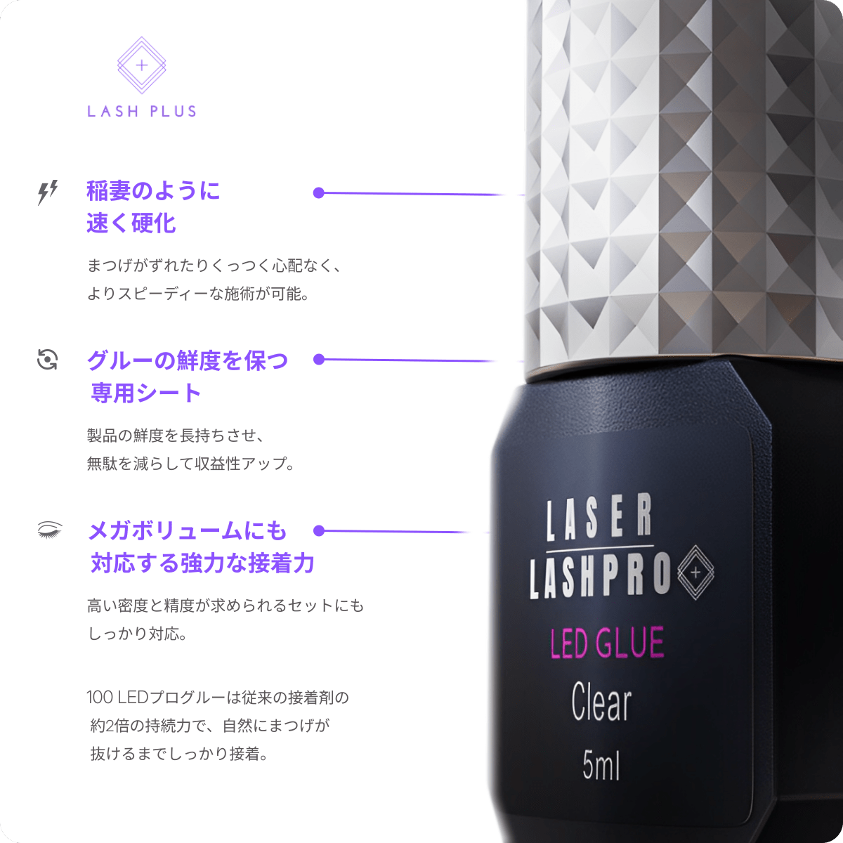 瞬時かつ安全に接着するよう設計されており、ラッシュの持ちを高めると同時に、お客様の快適さもサポートします。