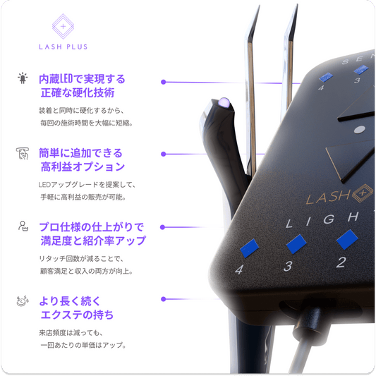 「まつげ技術者として、Lash Plusは私のツールキットの欠かせない部分となっています。先進的なLED技術により、迅速な硬化が可能で、アプリケーションプロセスが効率的で正確になります。さまざまなピンセットとの互換性があり、異なるクライアントの好みに応じて対応できる柔軟性もあります。業界におけるゲームチェンジャーです!」