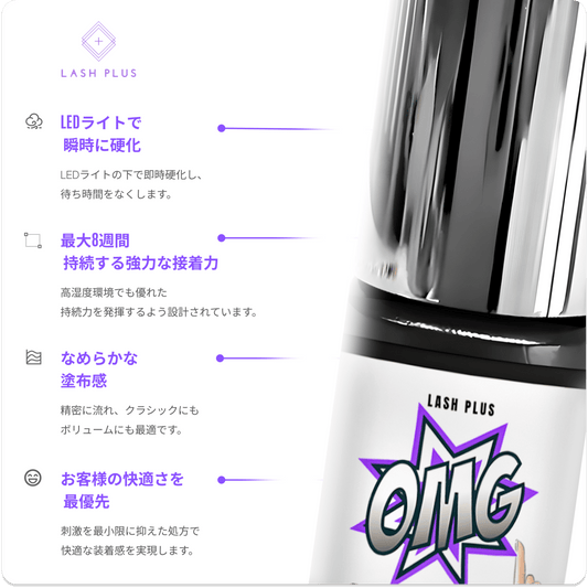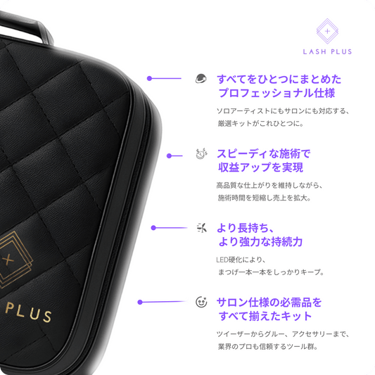 「Lash Plusをサロンに導入することは賢明な決断でした。その効率性と柔軟性のおかげで、全体のワークフローが改善されました。クライアントはまつげの持続力と迅速なアプリケーションプロセスを気に入っています。Lash Plusは私たちの基準を引き上げ、クライアントの満足度が向上しました。どのサロンにも必須のアイテムです!」